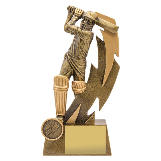 The Cricket Shazam trophy series offer an ideal option for all your player participation awards. Bowler, fielder, batter and a cricket theme options are offered in this range of stunning trophies. The Shazam Batsman Trophy is a suitable for your club’s special batting awards or for all your participation needs. These classic gold trophies present a dynamic batting theme against a lightning bolt inspired background. Available in 4 popular sizes. Free club logo insert available as well as Free engraving.