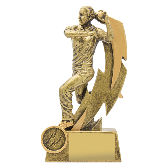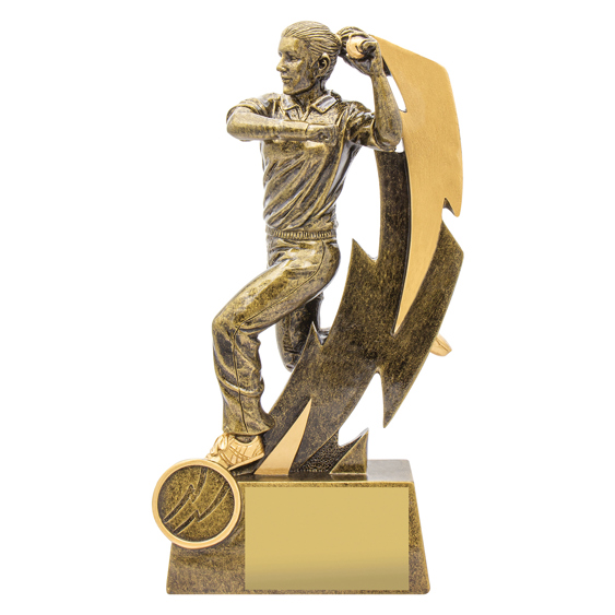 The Cricket Shazam trophy series offer an ideal option for all your player participation awards. Bowler, fielder, batter and a cricket theme options are offered in this range of stunning trophies. The Shazam Female Bowler Trophy is a suitable for your club’s special bowling awards or for all your participation needs. These classic gold trophies present a dynamic bowling theme against a lightning bolt inspired background. Available in 4 popular sizes. Free club logo insert available as well as Free engraving.