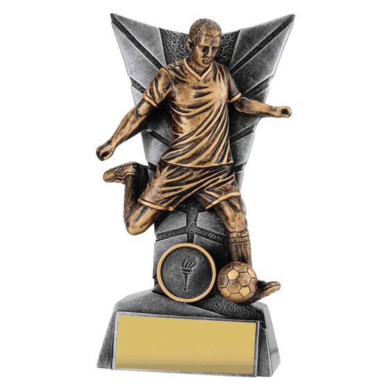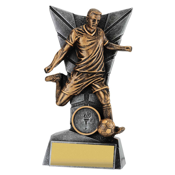 Dynamic silver backdrop for this trophy series frames the detailed player captured in action. Finished in antique gold, this player series is available in male and female and in multiple sizes to suit your award needs. Excellent choice for best player trophies for your team or club. The Delta Trophy comes with your free club logo insert and free engraving on the front gold plate.
