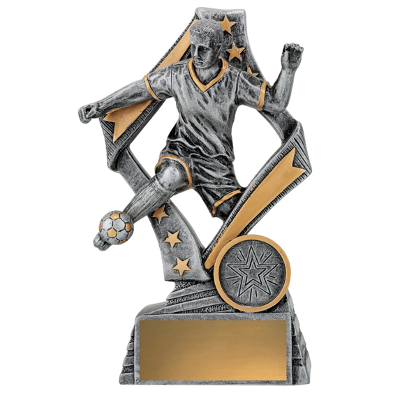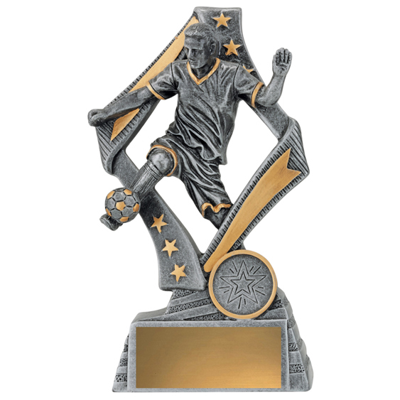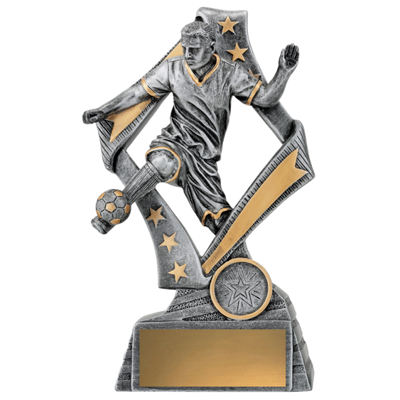 The Flag Football Player Male trophy features a stylish star based design with a male player in action. The Flag range of trophies are also available in a football theme or female player. Finished in antique silver colour with gold highlights. These soccer trophies are available in 4 sizes and include space for your free club logo centre and free engraving.