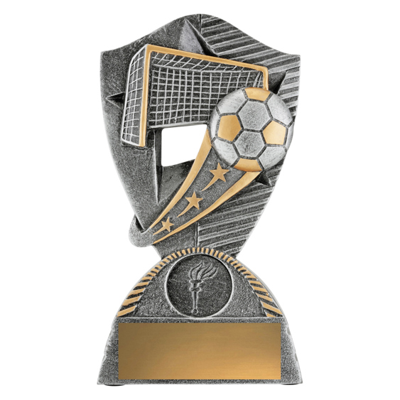 This a brilliant football trophy for your team or club. The Gambit offers a dynamic theme showcasing the ball and net on a star background in antique silver & gold. These great priced trophies are available in 3 sizes and include your free club logo centre and free engraving on a gold front metal plate.