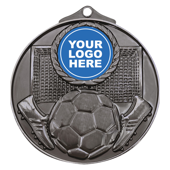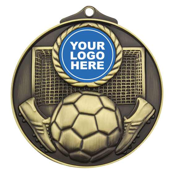 The Football Theme Logo Medals feature a classic ball, boot and net design. At a large 70mm in size these medals are available with either an antique gold or silver finish. This medal comes with your free club logo or sport custom insert. Each medal has space on the back for your free engraving requirements and come with a free neck ribbon in your choice of colour.