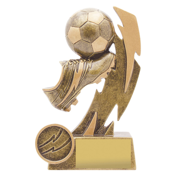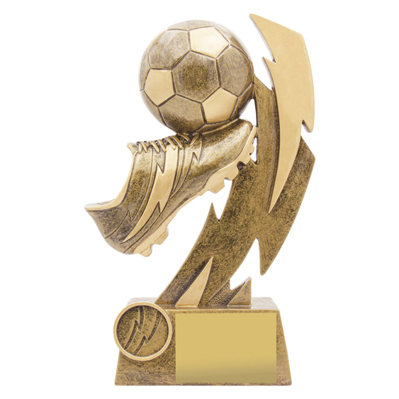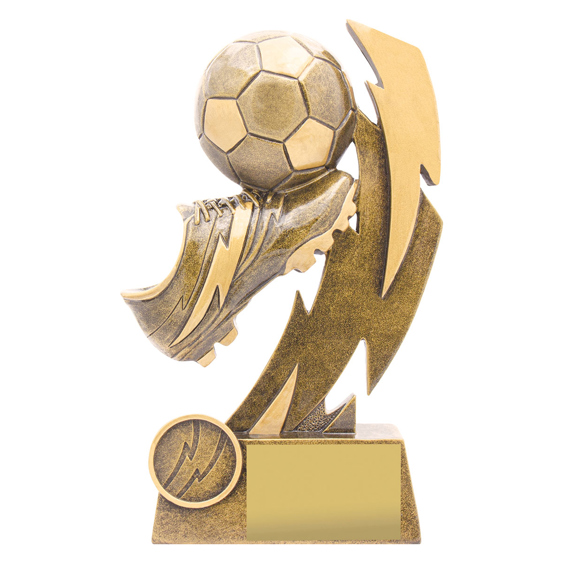 The Shazam series is a popular choice of trophy for all your participation needs with its striking and eye catching design. Choose from a football theme, male player or female player designs – all featured on a stylish lightning bolt background. Finished in traditional antique gold colours. These soccer trophies are available in a range of sizes with space for your free club logo centre and free engraving.